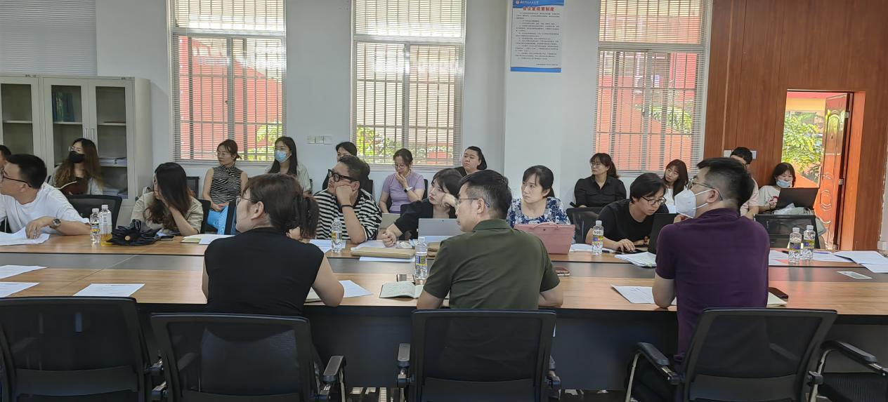 执行院长林伟欣博士根据视觉传达设计系和环境艺术设计系王才君、陈科两位系主任的汇报结合行政人员的任务完成量进行了简要的汇报小结,关于设计学院 2023 年度质量工程目标完成任务进行分解阐述。