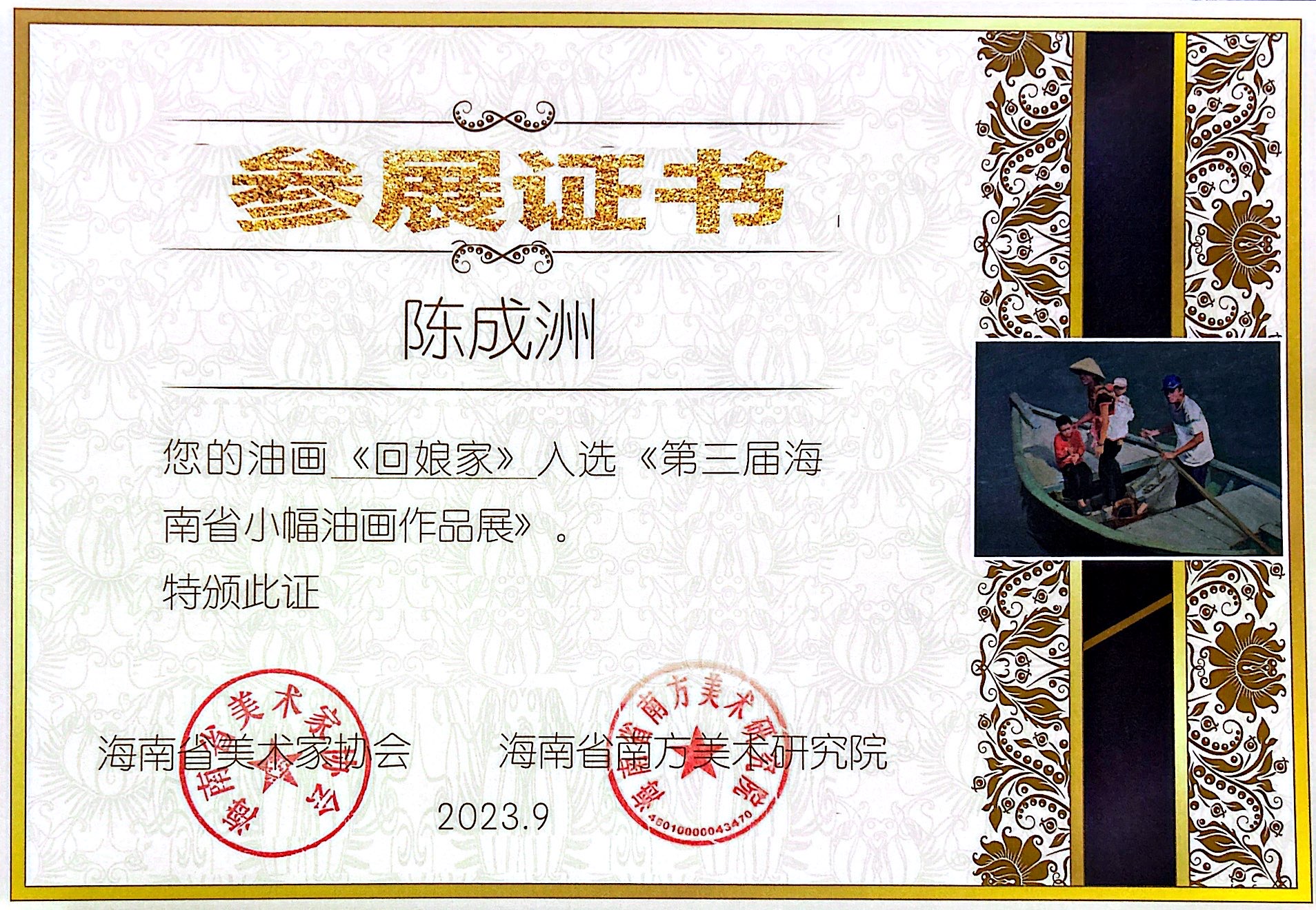 由海南省美术家协会与海南省南方美术研究院主办,海南省美术家协会油画艺委会、九三学社海南省文化艺术支社、三亚美术馆承办的第三届海南省小幅油画作品展在2023年9月9日至9月23日开展,其中我院2020级视觉传达设计专业学生陈成洲的油画作品《回娘家》入选参展。该画作重点描绘了各个人物的形态特征,父亲黝黑的皮肤和划桨时用力的手部肌肉,母亲在对话时笑脸盈盈的模样,以及沉浸在玩具世界的孩子和发呆的婴儿等,尽可能地展现出较为真实的生活气息。这是我校创建以来第一位油画作品入选省级展览的学生,也是体现我校教学质量水平提高的崭新起点,希望设计学院的师生们再接再厉,再创辉煌!