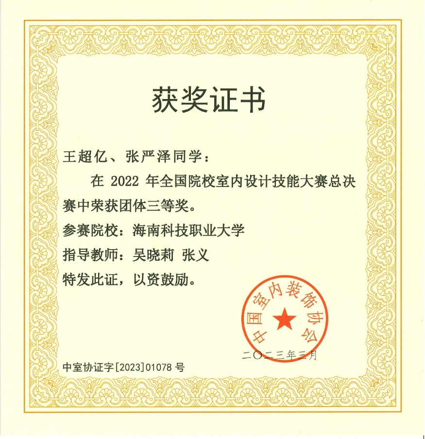 2022年全国院校室内设计技能大赛总决赛由中国室内装饰协会主办,北京电子科技职业学院承办,于2023年3月26日在北京落下帷幕。此次总决赛海南科技职业大学设计学院参赛选手王超亿、张严泽两位同学荣获国赛三等奖,指导老师张义、吴晓莉获得大赛“优秀指导教师”奖。