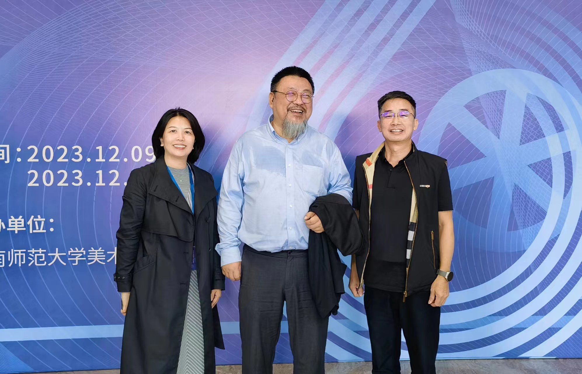 海南科技职业大学设计学院院长邱海东教授(右)与《装饰》杂志主编方晓风教授(中)交流后合影